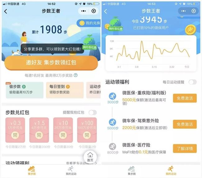 但社交立减金的花招还不止如此,“微保”作为一款保险类小程序,竟然将社交立减金进行变形——推出运动鼓励金,将保险与微信步数相结合。