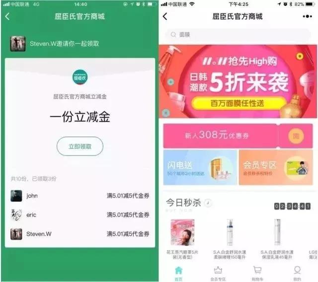“屈臣氏官方商城”小程序利用社交立减金,实现裂变传播拉新,相比App,线上电商获客成本降低了97%。拼多多也曾用“立减金”功能,让拉新成本< 10 元。
