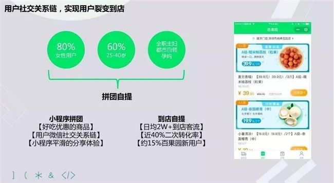 小程序上线 6 个月,月新增用户峰值 300 万+,通过拼团,百果园提升了20%的分享率和转化率。
